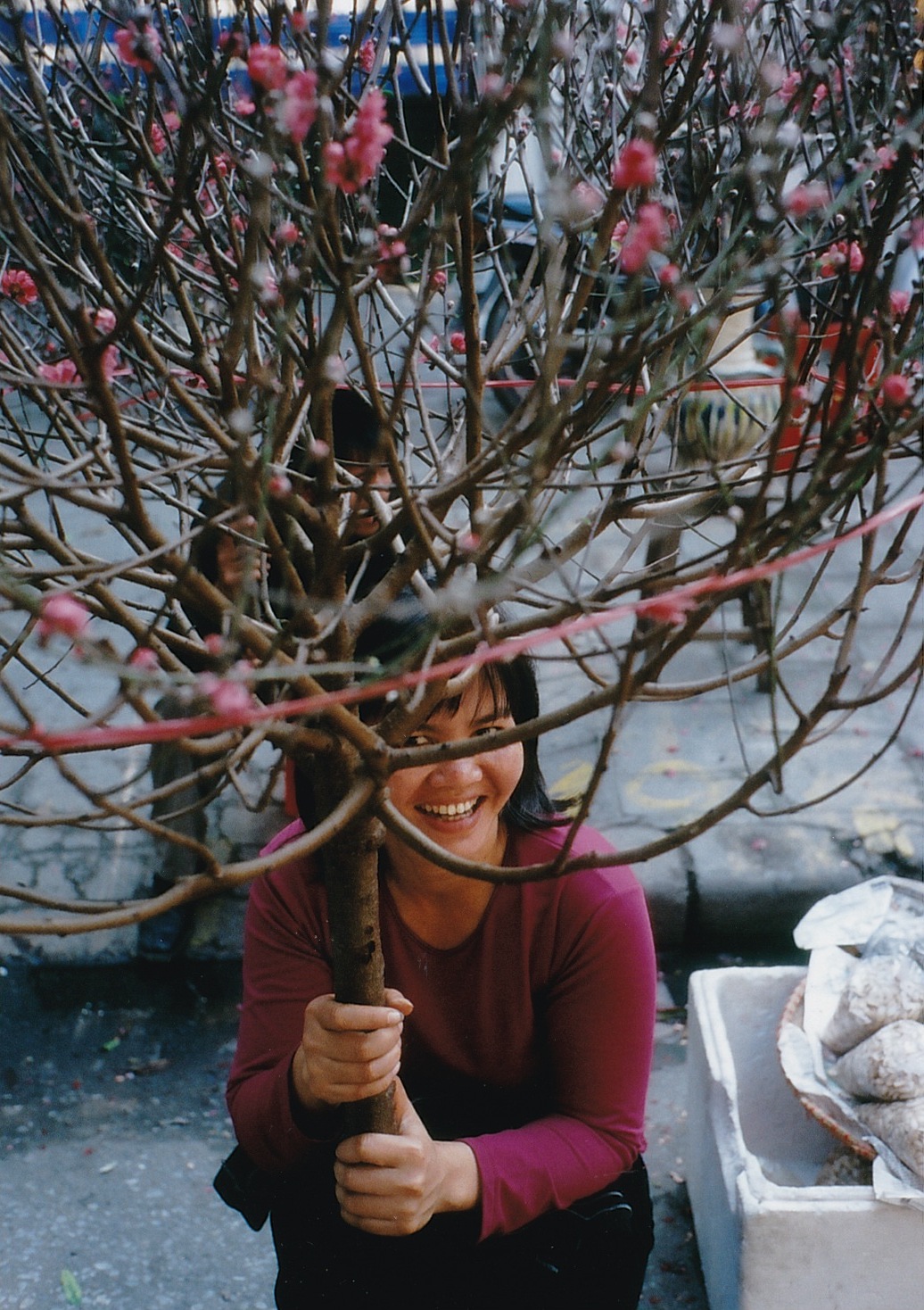(2003年2月、ハノイ市内で筆者撮影)正月飾り用の梅の花を撮ろうとしたら、ふいにオバちゃんが