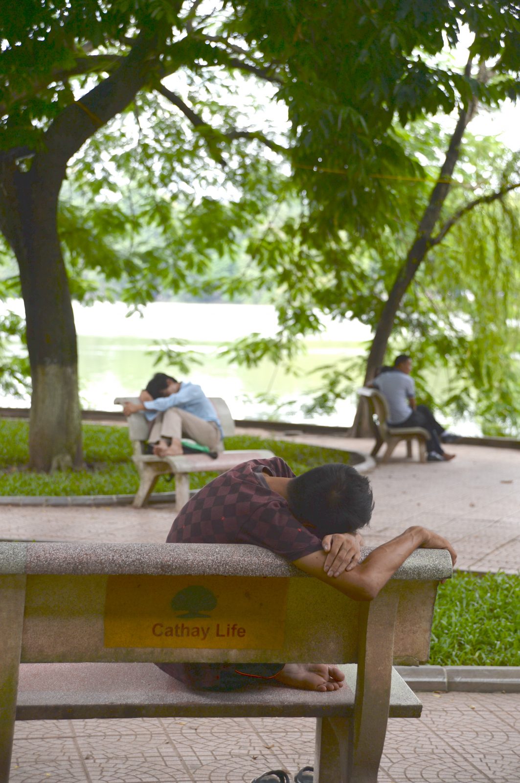 中央:うだる暑さの中、ハノイ中心部のホアンキエム湖畔で寝込むハノイ市民 (2016年9月、筆者撮影)