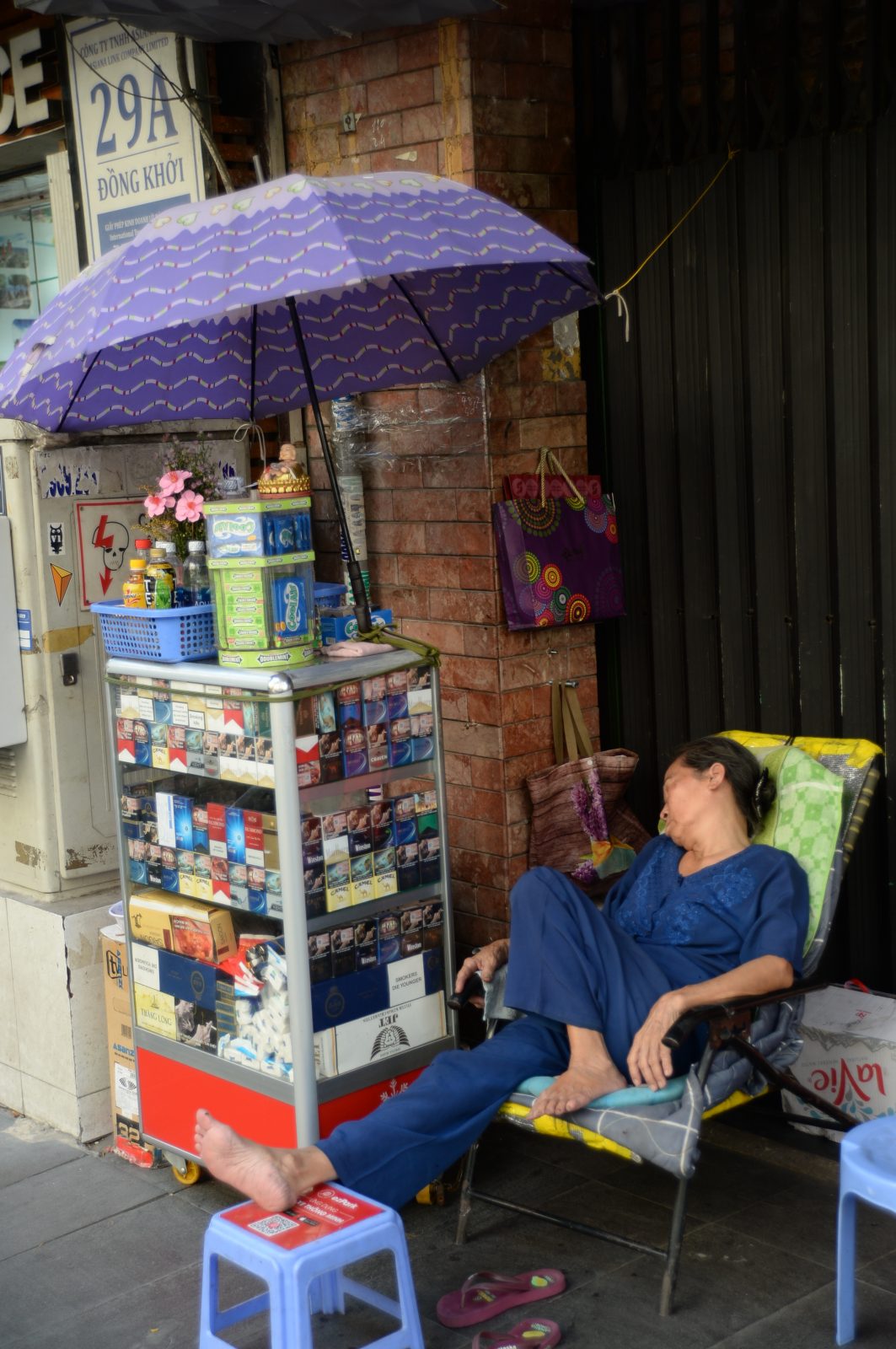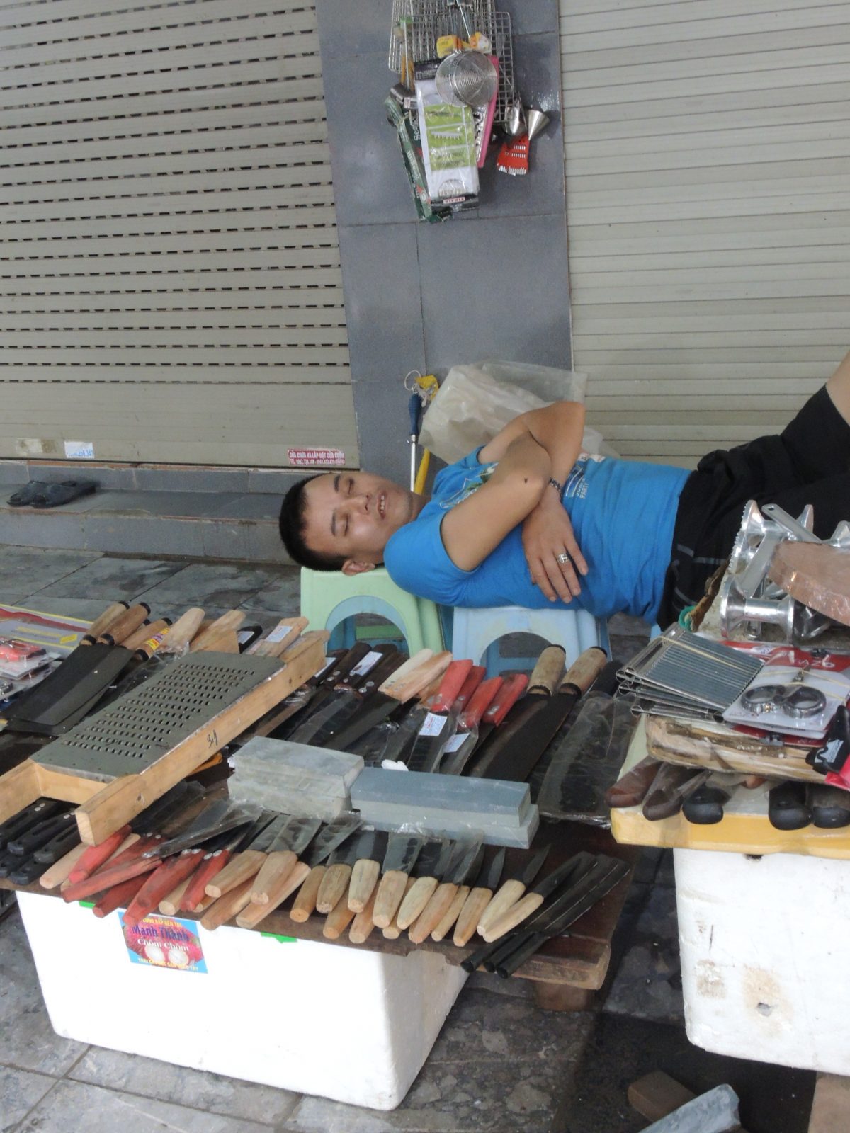 金庫を抱えたまま眠る靴屋の売り子さん (2015年7月、ハノイ市内で筆者撮影)