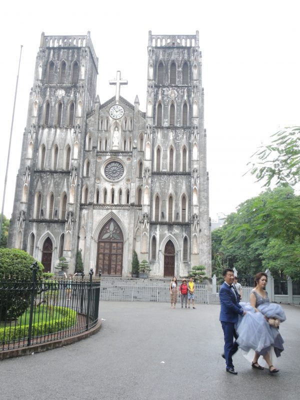 (2017年9月:筆者撮影)記念写真を撮影後、ハノイ大教会を去る新婚カップル。