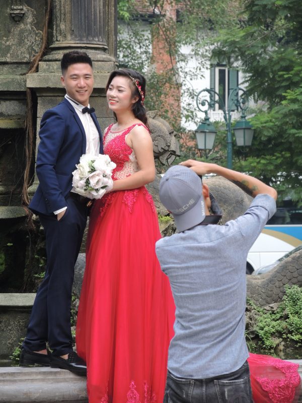 ホアンキエム湖近くで記念写真を撮る新婚カップル