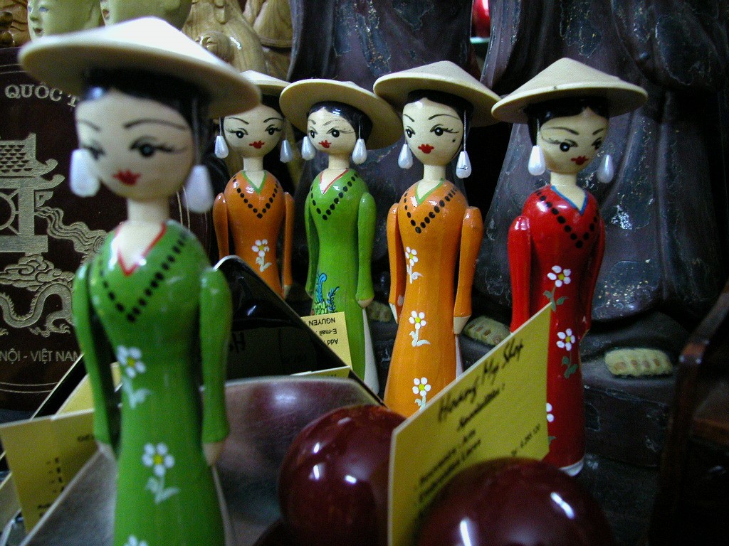 ハノイ旧市街の土産物店にて (2002年8月/筆者撮影)制服のアオザイをまとい、仕事に向かうベトナム航空のCA