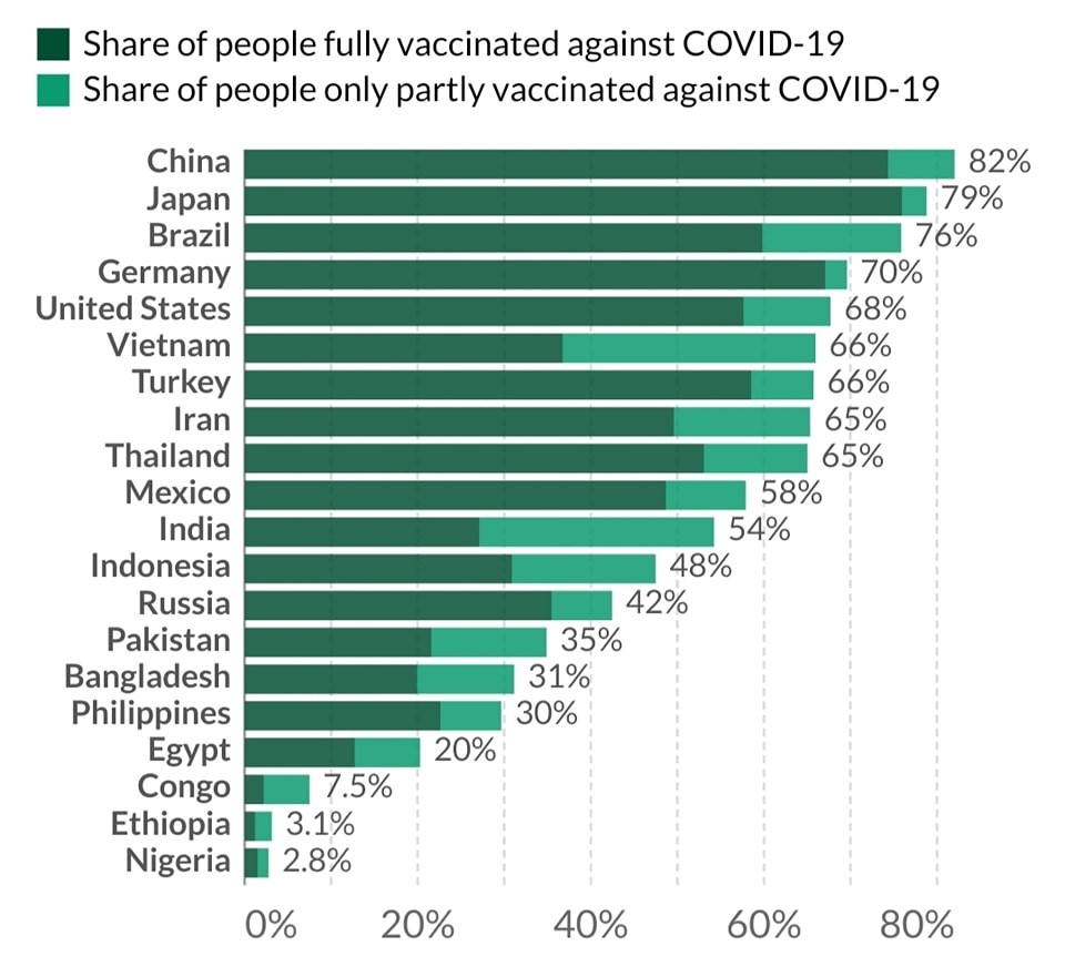 Theo thống kê, Trung Quốc đang là quốc gia có độ phủ tiêm Vaccine lớn nhất thế giới với tỉ lệ 82%. Nhật Bản đứng thứ 2 với tỉ lệ 79%. Thứ 3 là quốc gia Nam Mỹ Brazil.