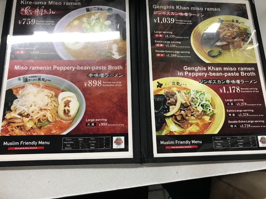 Seperti yang sudah disebutkan, kedai ramen Houryu ini memiliki menu halal. Jadi bagi muslim bisa menyantap ramen khas Hokkaido ini tanpa perlu khawatir. Tetapi tidak semua menu di kedai ini adalah halal. Untuk penanda, peralatan ramen untuk muslim diberi warna berbeda dengan peralatan makan biasa. Kita tidak perlu khawatir lagi jika koki salah menaruh kuah yang tidak halal, atau menghidangkan makanan yang salah. Ada beberapa menu yang ditawarkan, di antaranya Kireuma miso ramen, Genghis Khan miso ramen, Genghis Khan karamiso ramen (ramen miso pedas), dan ada juga makanan sampingan yaitu gyoza halal.