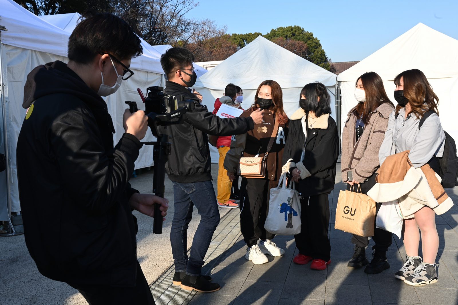 2021年12月11日、筆者撮影フェスティバルのブース内で編集を続けるコイさん(左端)ら