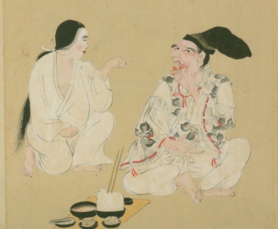 Bức tranh cuộn được vẽ vào thời Heian có tên là “Bệnh thảo chỉ (病草紙) “, một tư liệu quý giá mô tả tình trạng bữa ăn của người dân thường. Bức tranh mô tả một người đàn ông bị viêm nha chu, răng của ông ta lung lay, đau đớn và không thể cắn được. Điều chú ý ở bức tranh này hình ảnh về chiếc đũa. Đôi đũa đang được cắm thẳng xuống trong bát cơm. Một hình ảnh thường được thấy trong các đám tang thời hiện đại, việc cắm đũa vào cơm trong bữa ăn như thế được cho là húy kỵ.