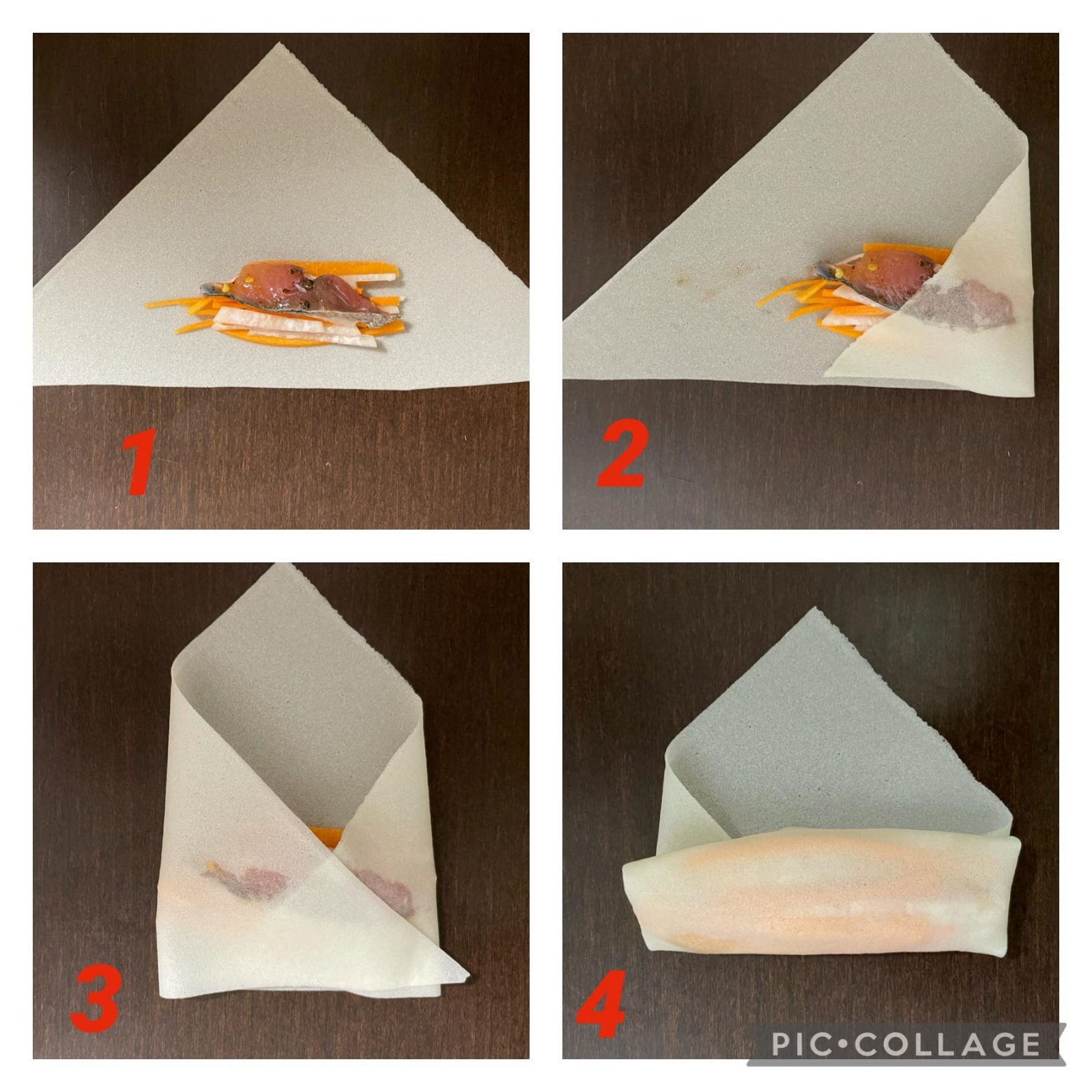 Cách cuốn nem thực hiện như thông thường: cho lượng vừa đủ cá+cà rốt+củ cải trải dọc lên lá nem, gấp lần lượt 2 cạnh như ảnh minh họa, kết dính mối nối cuối cùng bằng chút nước.