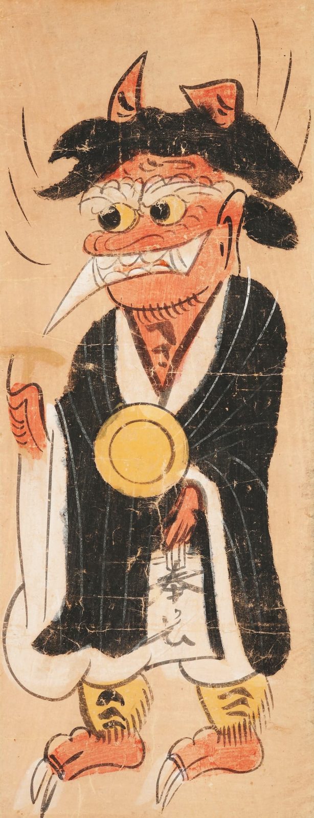 Bức tranh đơn giản, nhưng có nét đường nét tạo bạo, phóng túng với gam màu nhấn là cam. Con quỷ mặc áo choàng nhà sư, cổ đeo cái chiêng. Tay trái cầm cuốn sổ danh sách người cúng dường, tay phải cầm cái búa. Đầu mọc sừng, nhưng một sừng bị vỡ. Quỷ ở đây đại diện cho trái tim của con người. Quỷ đột lốt nhà sư đại diện cho “kẻ giả hình”. Chiếc sừng tượng trưng cho sự “ngã chấp”. Một bên sừng bị vỡ biểu hiện ý “cái ngã hỏng mất rồi”. Ngoài ra, bức tranh còn có tác dụng như là lá bùa để ngăn trẻ em khóc vào ban đêm.