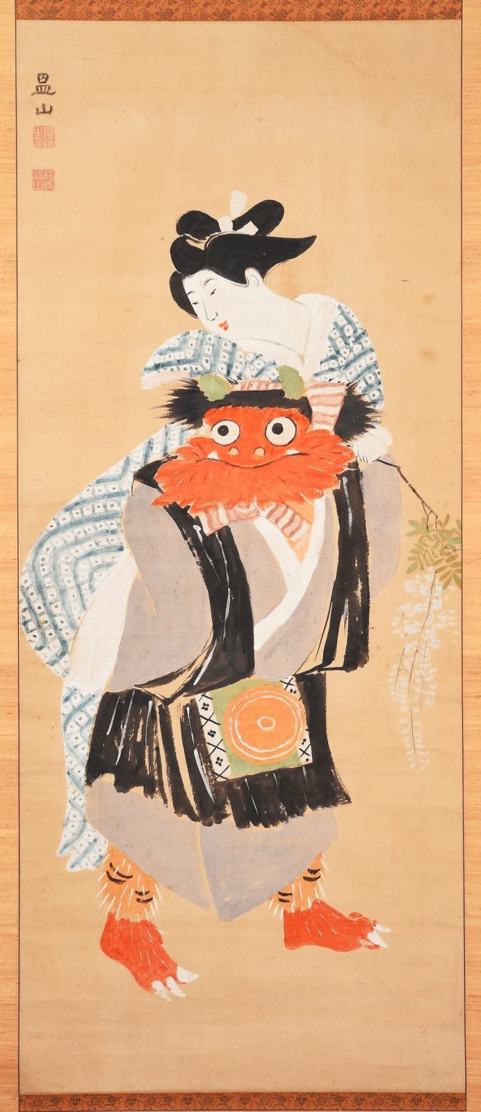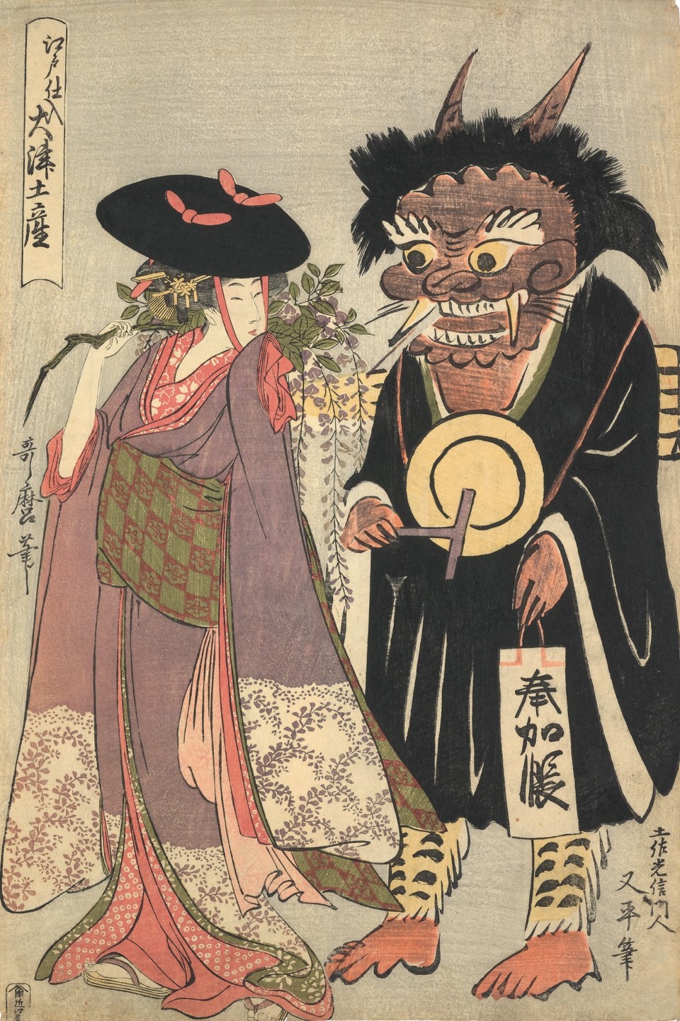 Mô-tuýt quỷ đi cùng với một mỹ nữ cũng là một mô-tuýt khá phổ biến trong giai đoạn này. Hãy xem tác phẩm thú vị như sau, Quỷ niệm Phật đằng nương đồ (鬼念仏藤娘図), vẽ cảnh quỷ đang cõng một mỹ nhân cầm hoa tử đằng.